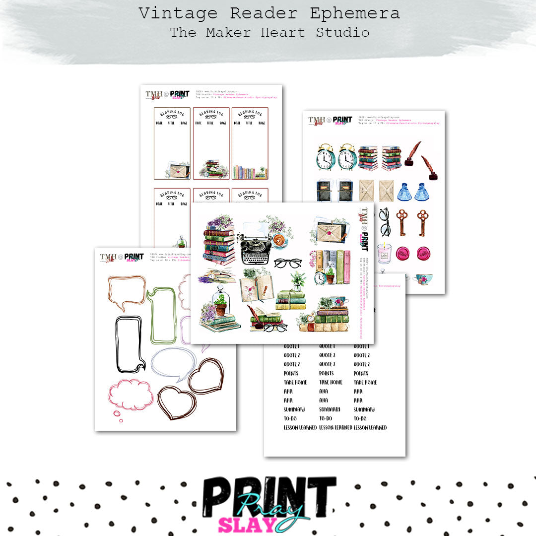 The Vintage Reader is a cozy watercolor sticker set inspired by book lovers, writers, and reflective souls. This collection features hand-painted stacks of books, vintage typewriters, envelopes sealed with wax, reading glasses, clocks, coffee cups, florals, and delicate botanical accents.